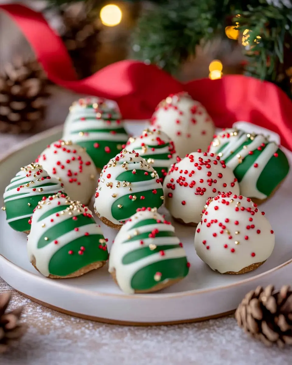Instead of using only white chocolate, try mixing in some semi-sweet or dark chocolate chips. This combination will add depth to the flavor and provide a beautiful contrast to the festive colors of the truffles. You can even create a marbled effect by swirling the two types of melted chocolate together before dipping the truffles.