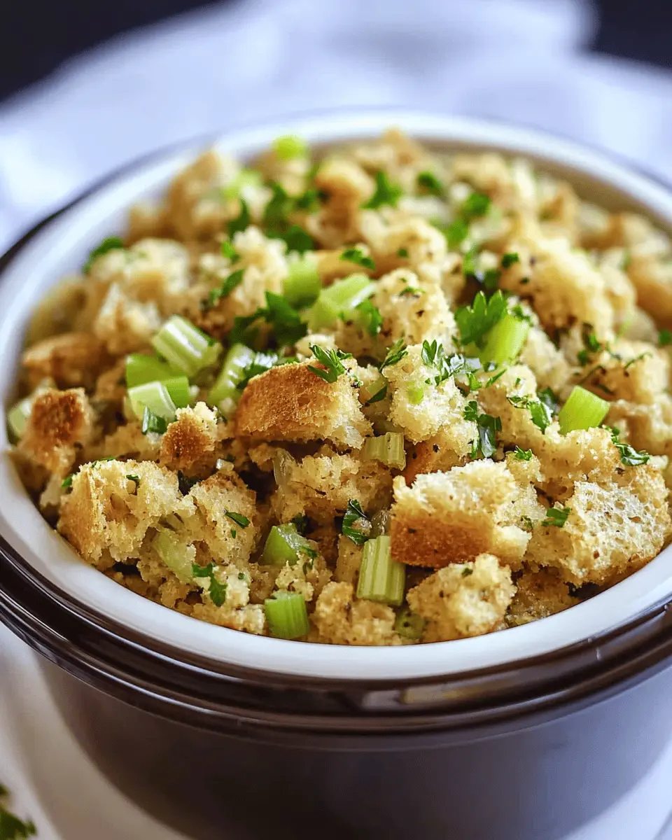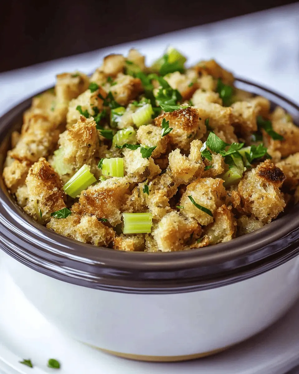 A delicious and easy recipe for stuffing cooked in a crockpot, perfect for holiday meals.